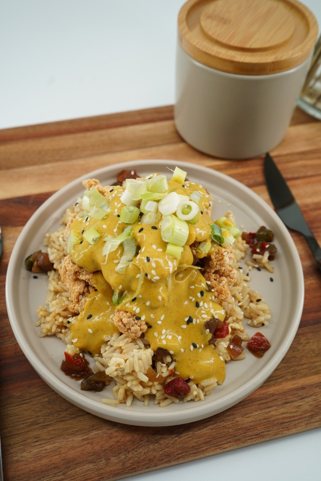 Salt & pepper chicken (WHEAT), egg noodles (WHEAT, EGG), curry sauce (WHEAT, MUSTARD), light soy sauce (SOYA, WHEAT), mixed vegetables, garlic, sesame seeds, ginger, black pepper.